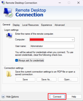 Ketik alamat IP publik VM Windows Anda dan klik “Connect”.