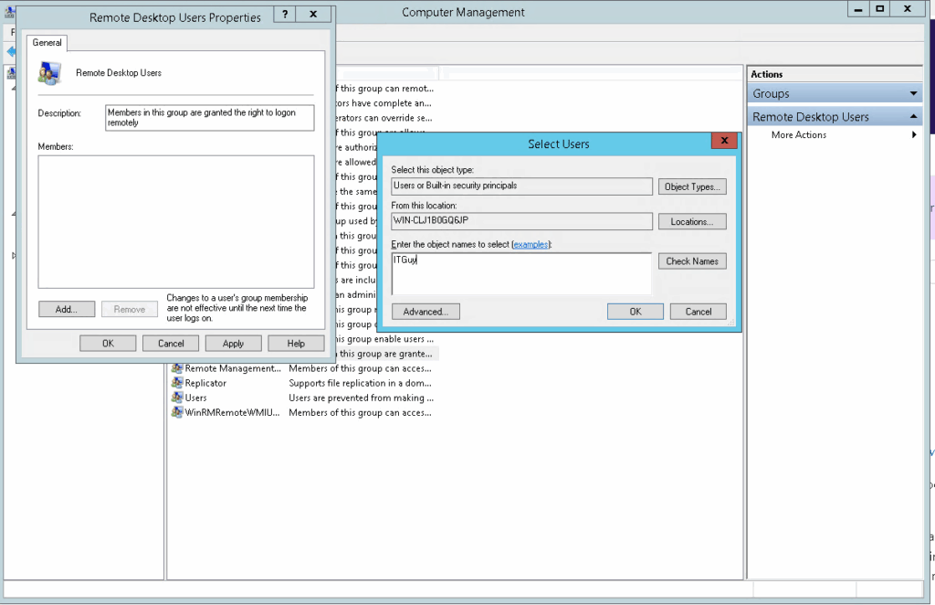 Pada Menu Computer Management Sub-Menu Local Users and Groups Pilih Folder Groups Kemudian pilih Remote Dekstop Users.
