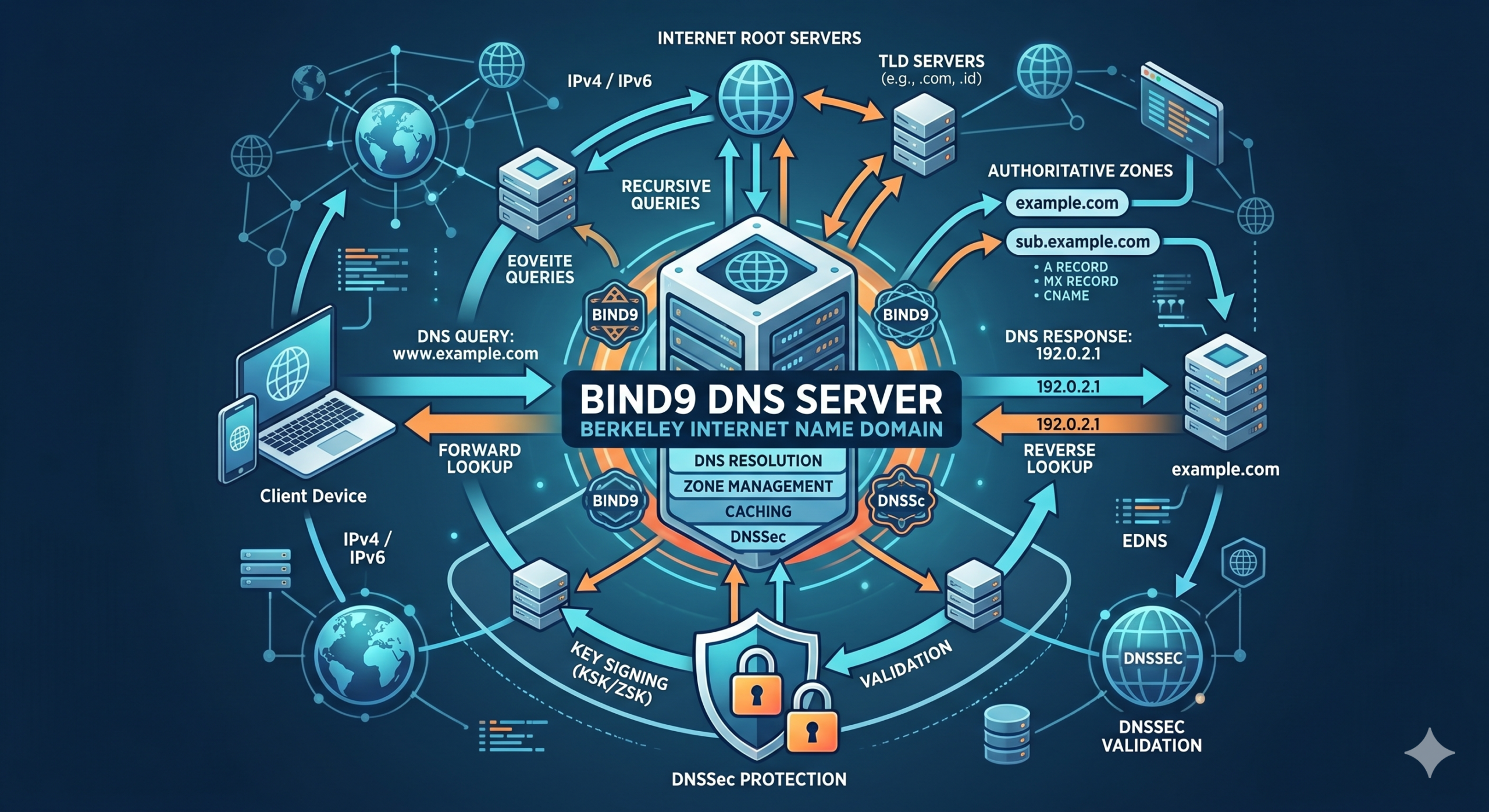 BIND9 (Berkeley Internet Name Domain) adalah perangkat lunak open-source yang berfungsi sebagai buku telepon internet tersebut (DNS Server). Tugas utamanya adalah menerjemahkan nama domain yang mudah diingat manusia (seperti namadomain.com) menjadi alamat IP yang dipahami komputer (seperti 103.10.X.X). BIND9 adalah standar industri yang hingga kini menjadi tulang punggung infrastruktur DNS di seluruh dunia.