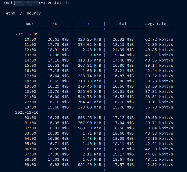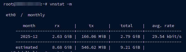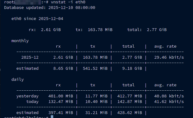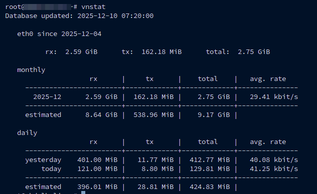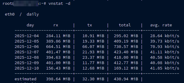 vnstat akan menampilkan statistik penggunaan bandwidth pada semua interface yang terdapat di dalam VPS tersebut. Data yang ditampilkan merupakan kalkulasi penggunaan bandwidth per bulan dan per hari.