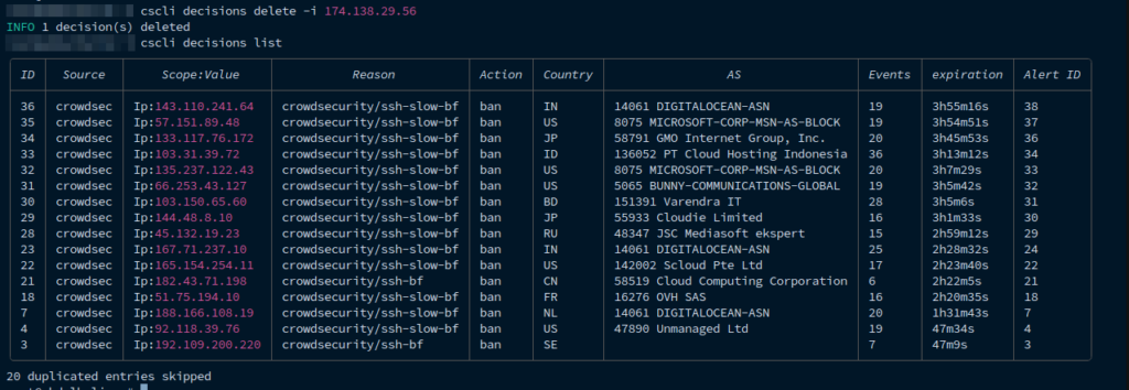 Begitu Bouncer terpasang, ia akan otomatis berkomunikasi dengan mesin CrowdSec. Mulai dari titik ini, setiap kali ada IP berbahaya yang terdeteksi secara lokal maupun dari daftar global, firewall VPS Anda akan langsung men-drop koneksi dari IP tersebut.
